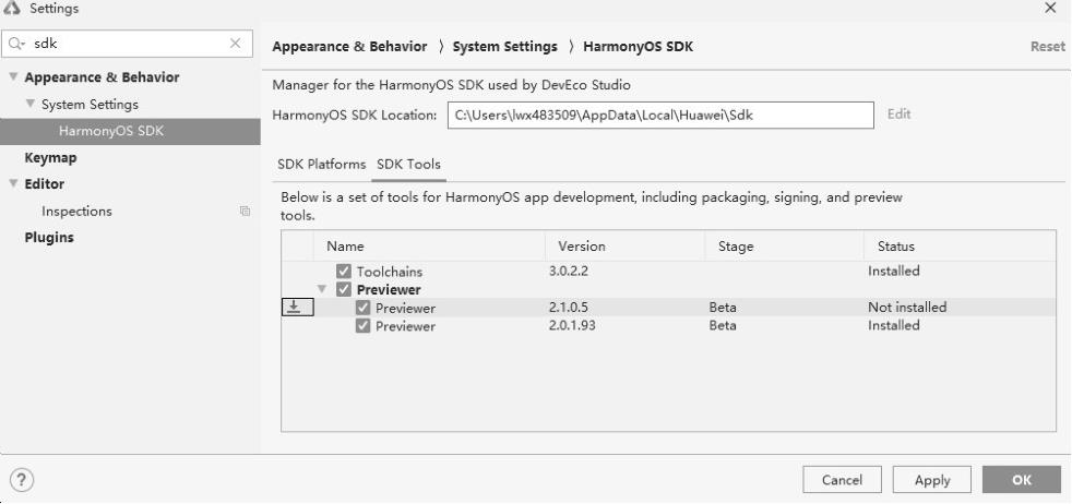 在使用预览器查看应用界面的UI效果前,需要确保HarmonyOS SDK→SDK Tools中已下载Previewer资源,如图3-15所示。
