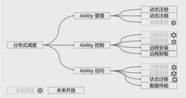 与PC不同,移动终端的一个短板在于其硬件资源和电池存在一定瓶颈,这决定了在为移动终端设计Ability时,这些Ability需要按需启动或者关闭。分布式任务调度平台提供了管理远程Abi-lity的能力,即支持启动Page模板的Ability,以及启动、关闭Service和Data模板的Ability。