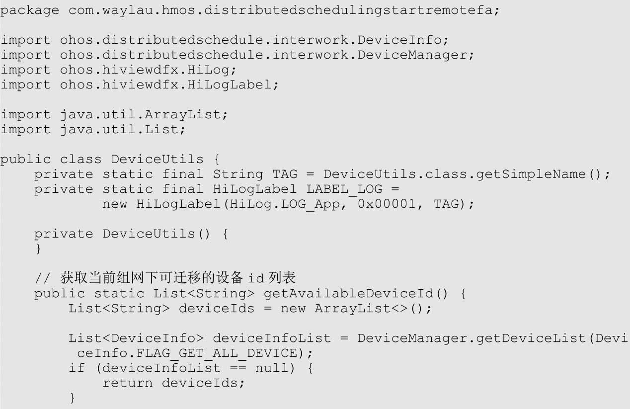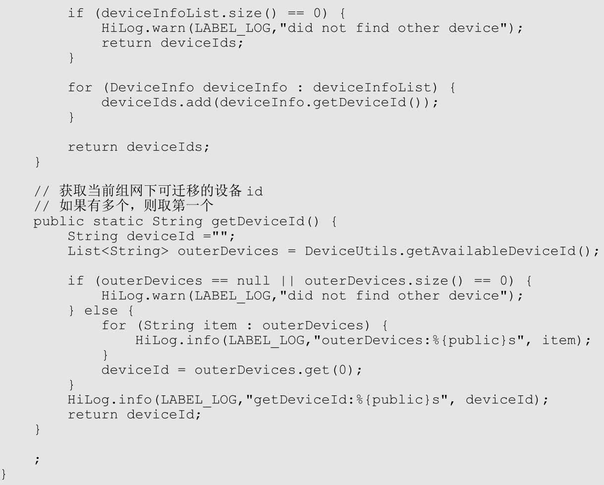 (2)DeviceUtils.getDeviceId()方法主要用于返回设备Id。该方法内部调用DeviceManager的getDeviceList接口,通过FLAG_GET_ONLINE_DEVICE标记获得在线设备列表,并从中选择任意一个(这里是选第一个)作为返回设备Id。
