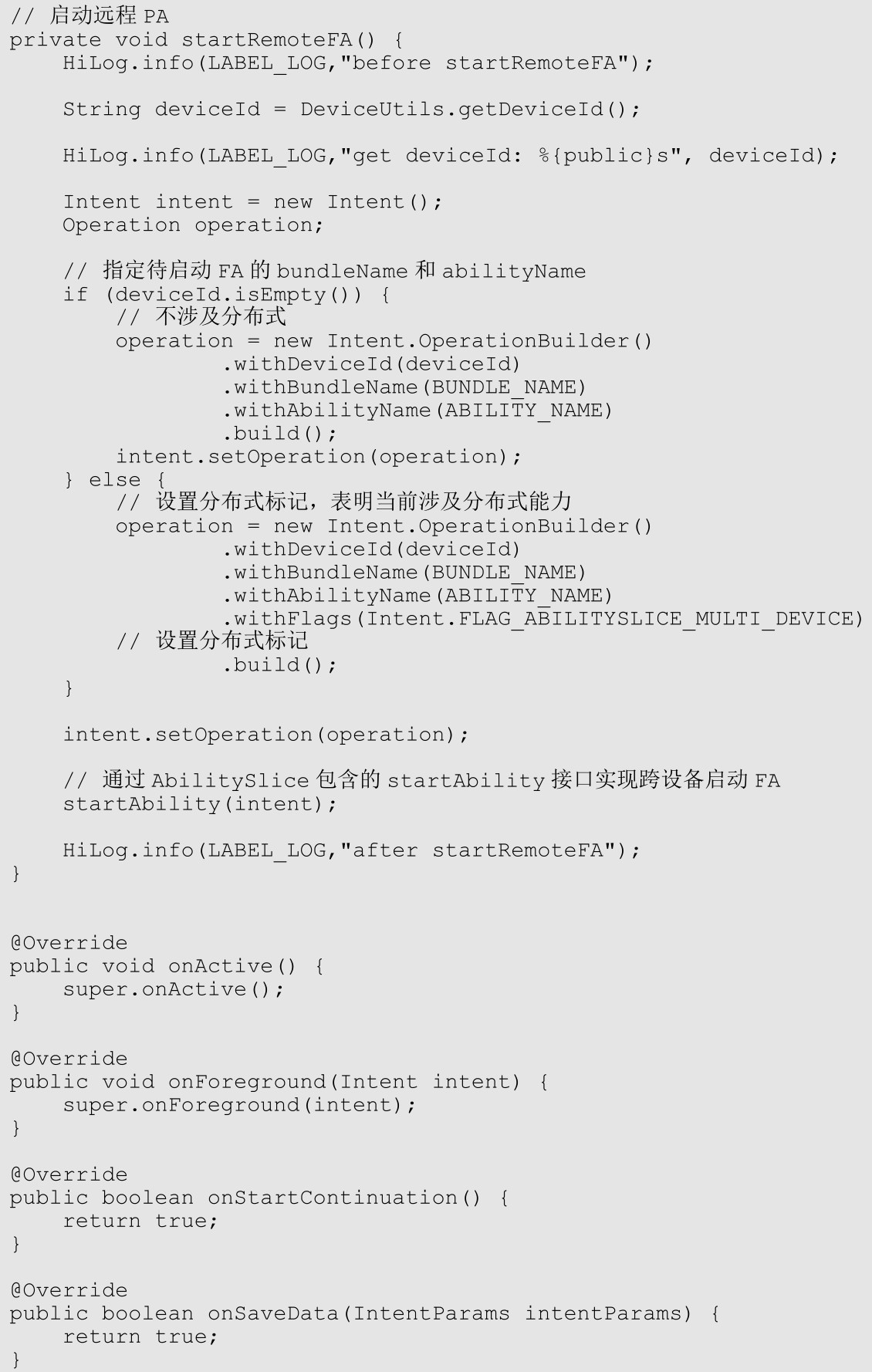 ③通过AbilitySlice包含的startAbility接口实现跨设备启动FA。