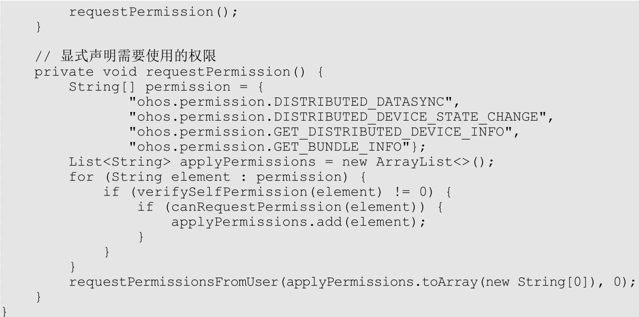 此外,对于三方应用还要求在实现Ability的代码中显式声明需要使用的权限,代码如下: