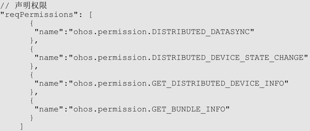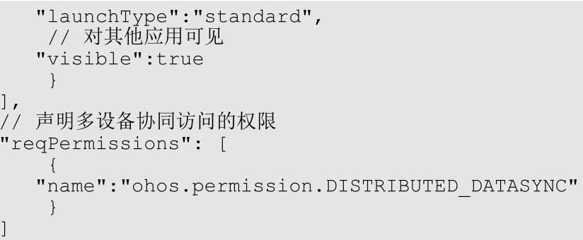 (2)reqPermissions声明多设备协同访问的权限ohos.permission.DISTRIBUTED_DATASYNC。
