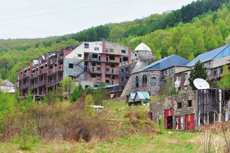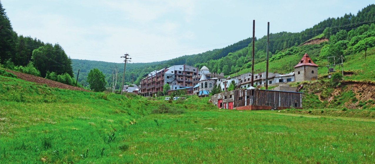 已变得荒凉的塞北滑雪场,“雪人宾馆”还清晰可辨。2016年6月9日。