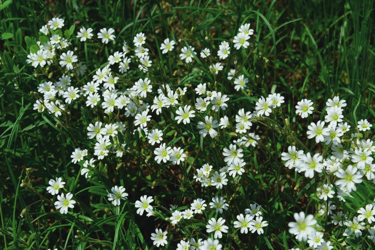 石竹科卷耳旺盛地生长在废弃的塞北滑雪场林缘。