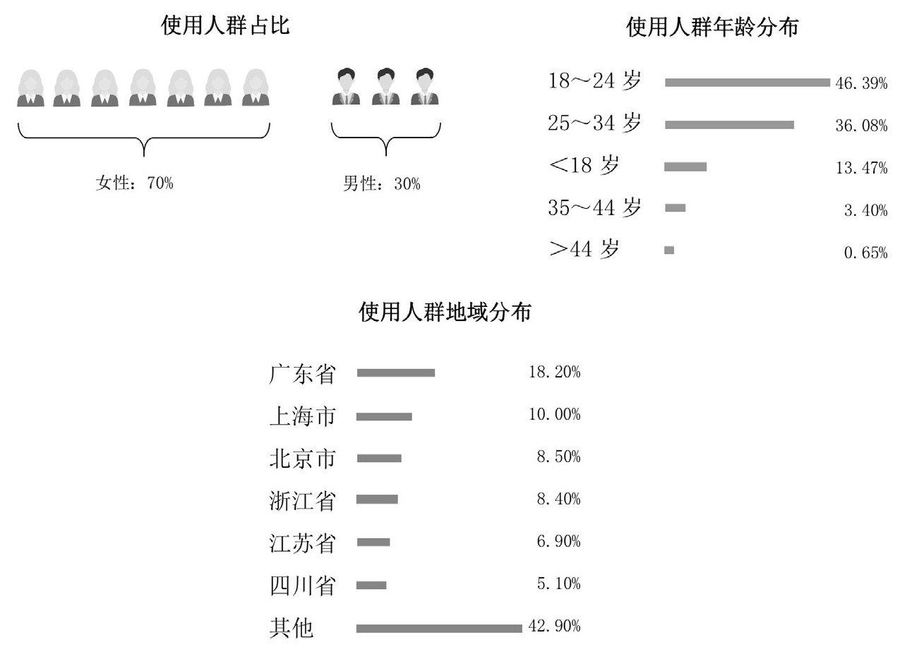 从性别上来看,目前小红书的主要用户群体为女性,占比高达70%;从年龄上看,目前小红书的用户群体年龄主要集中在18~34岁,这一年龄段的用户占比为82.47%,且年龄在18岁以下的用户占比也已经超过了10%,说明其活跃用户的年轻化趋势正在增强;从地区分布来看,目前小红书的用户群体主要集中在北京、广州、上海、深圳等一线城市,其他分布地区也以二线城市为主。