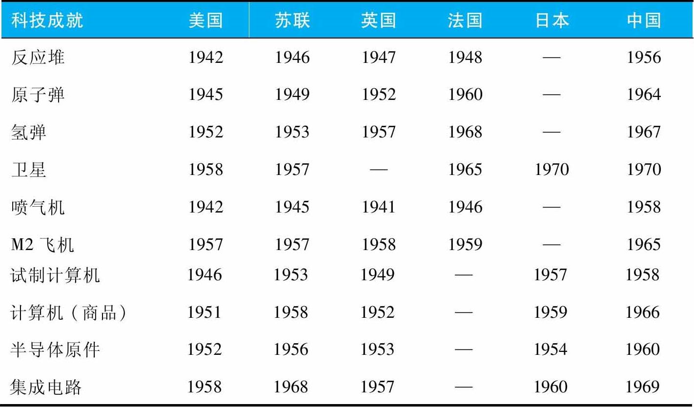 中国政府在充分论证并决定战略方向之后,能够全面部署、快速动员地方政府和机构参与,通过行政体系确保高效执行。中华人民共和国成立之初就确定了重大战略项目,调动全国的科技人员重点攻关、相互协作,在援助基础上不断钻研,成功取得了突破。当时经济落后的中国能紧追发达国家的科技步伐(见表1.2),靠的就是重点突击、集中力量、组织动员的国家战略和意志。