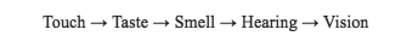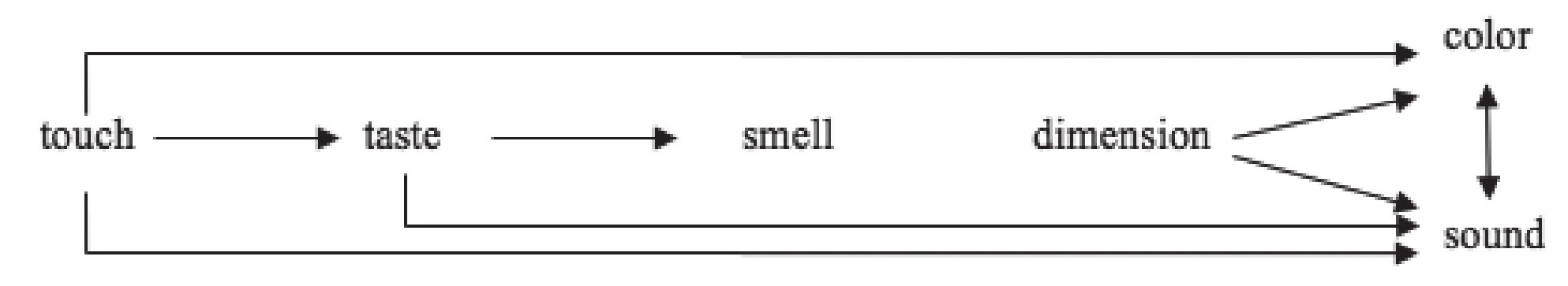 The first model originated from research on linguistic synaesthesia in poetic languages by Ullmann (1945,1957,1966 [1963]). Based on around 2,000 synaesthetic examples collected from English,French,and Hungarian poems from the nineteenth century,Ullmann (1957)found that over 80% of the synaesthetic expressions conformed to the directional pattern described by the model in Figure 1.