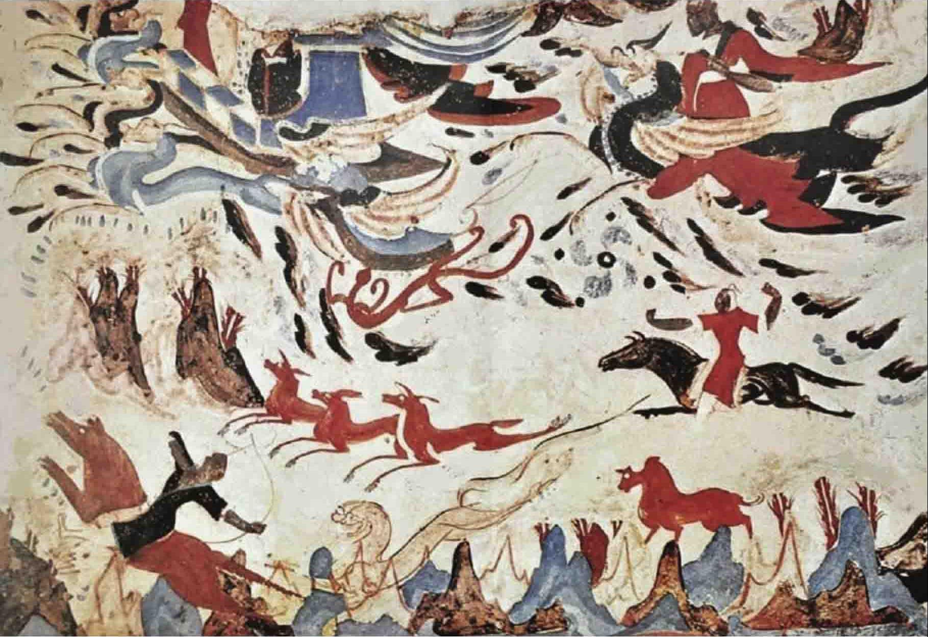 自然条件的差异,使干寒的西北成为游牧区,繁衍着无城郭、礼仪,游牧为生,全民善骑战的游牧文明。图为敦煌莫高窟描绘狩猎场景的壁画。
