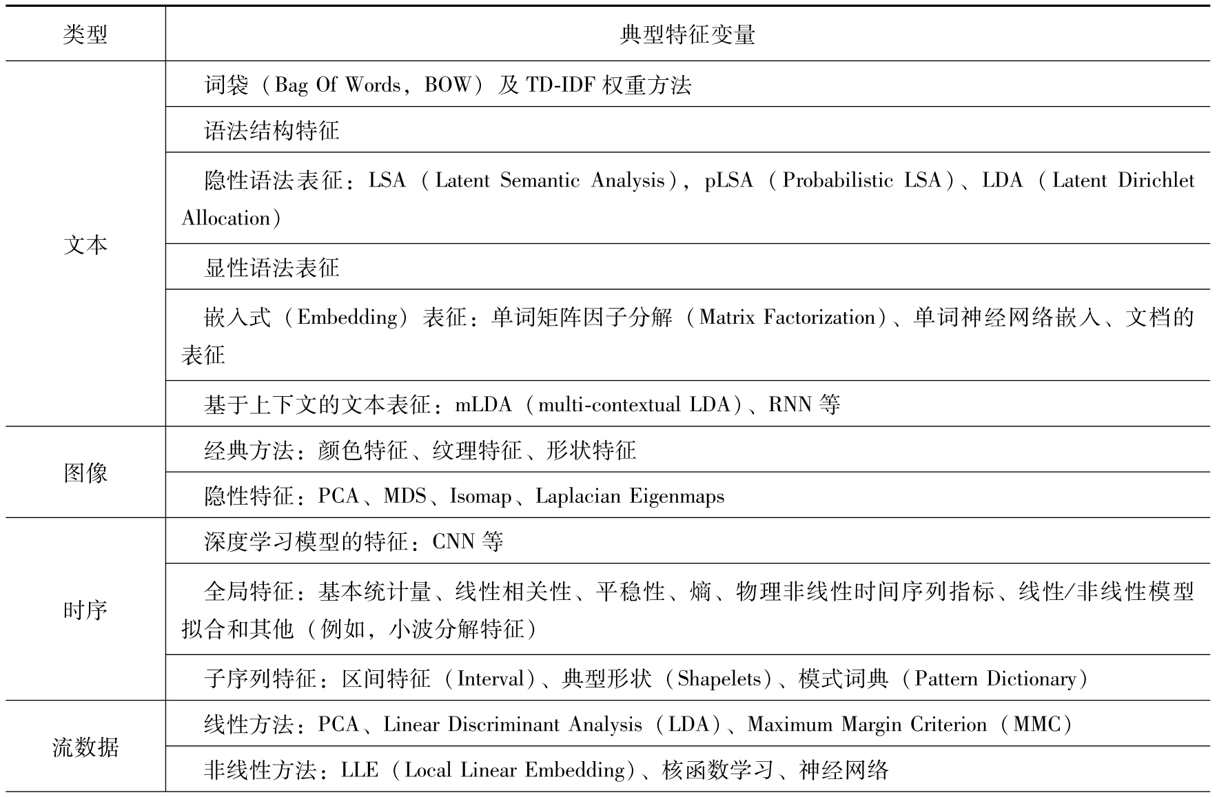 Dong、Liu主编的图书 Feature engineering for machine learning and data analytics [22] 中按照数据类型、通用算法、领域应用三个维度对特征工程技术进行了论述。在数据类型中,文本、图像、时序、流数据、序列数据(Sequential Data)、图/网络等6类数据常见特征见表2-6。Duboue [23] 对图数据、带时间戳数据、文本数据、图像数据、视频、GIS等数据的特征提取也有很好的介绍和案例分析。