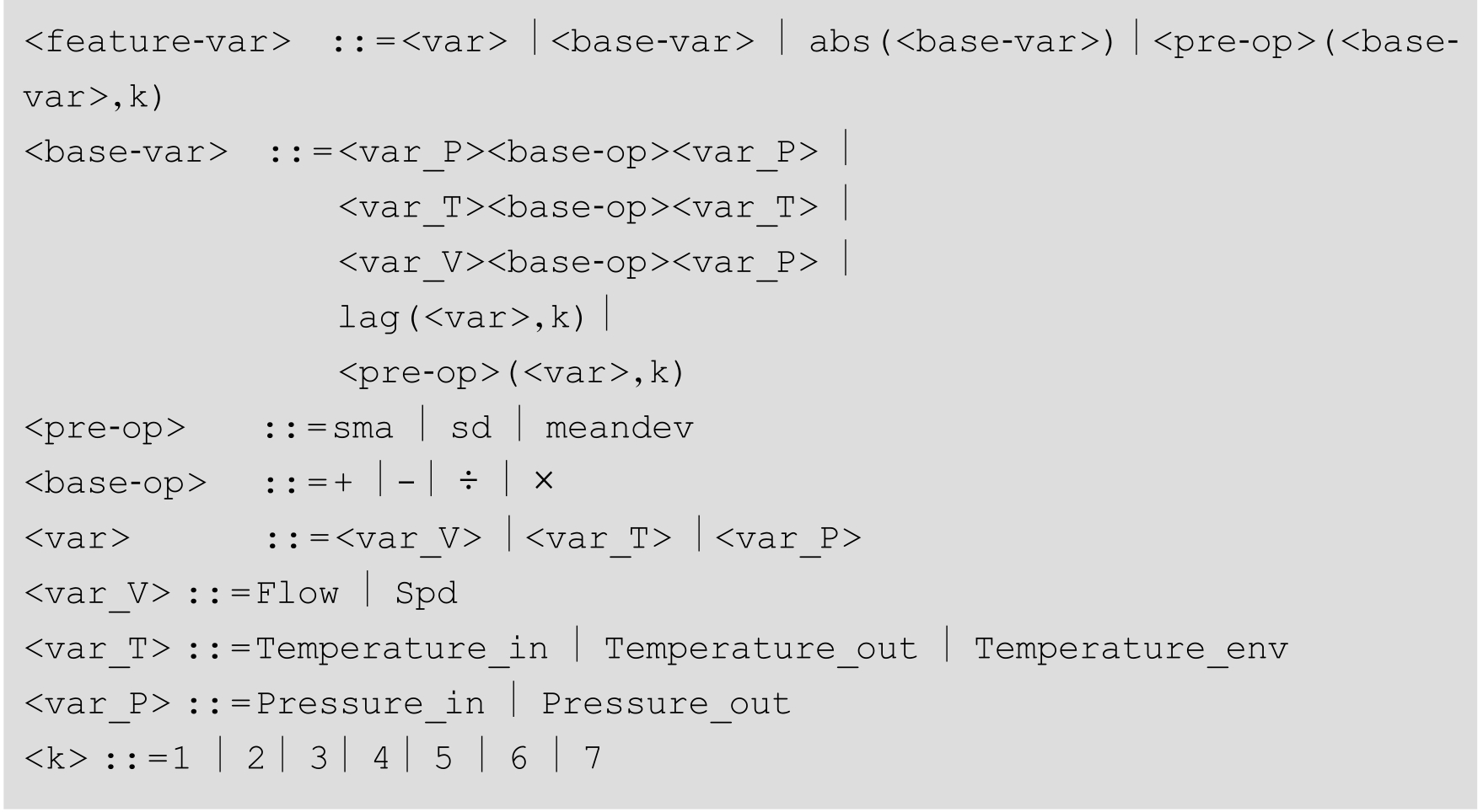 基于此语法,可以生成很多特征变量,例如,进口压力的5阶平滑sma(Pressure_in,5)、进出口压力的方差sd(Pressure_out-Pressure_in)、Flow/Pressure_in等特征量,基于历史数据集,可以挑选与能耗相关度高的特征表达式。