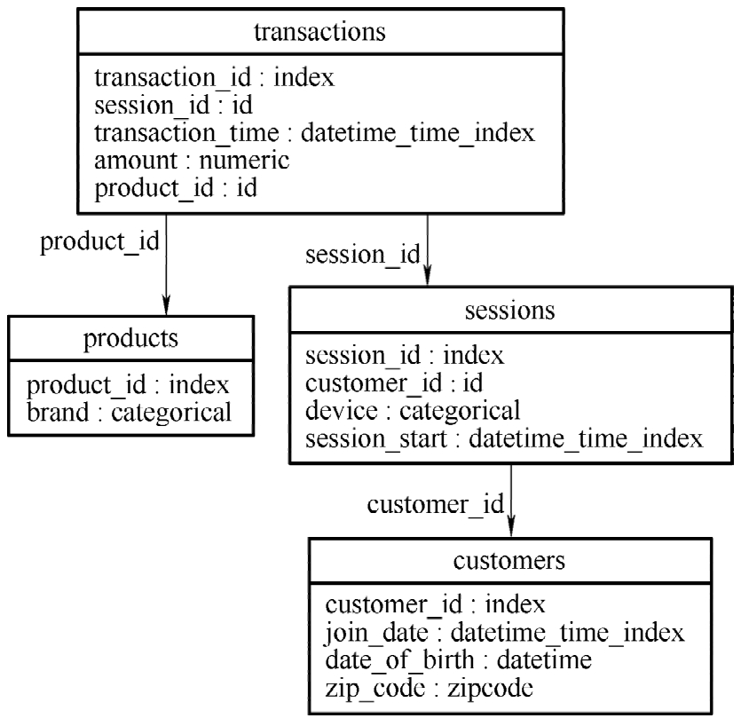 在工具内置的客户(customers)画像特征例子中,包括4个数据实体,一个客户可能有多个会话(sessions),一个会话中可能涉及多个产品交易项(transactions),一个交易项目涉及一个产品(products),在这样的结构下,客户的特征可以是会话的数量、终端设备的种类数、平均会话时间、交易的笔数、不同类产品的购买量等变量,如图2-17所示。