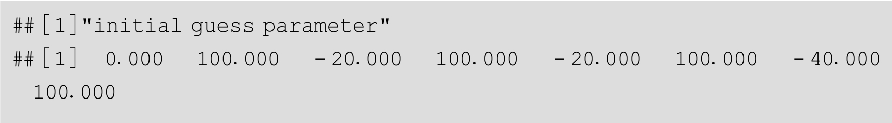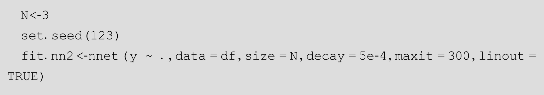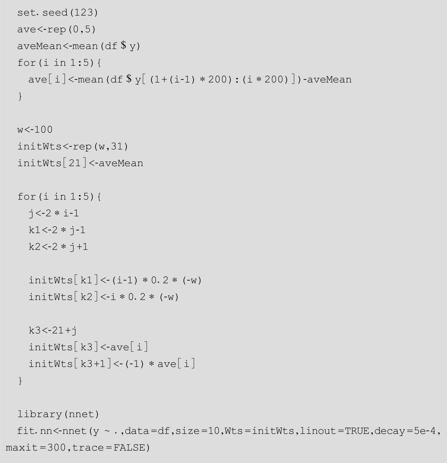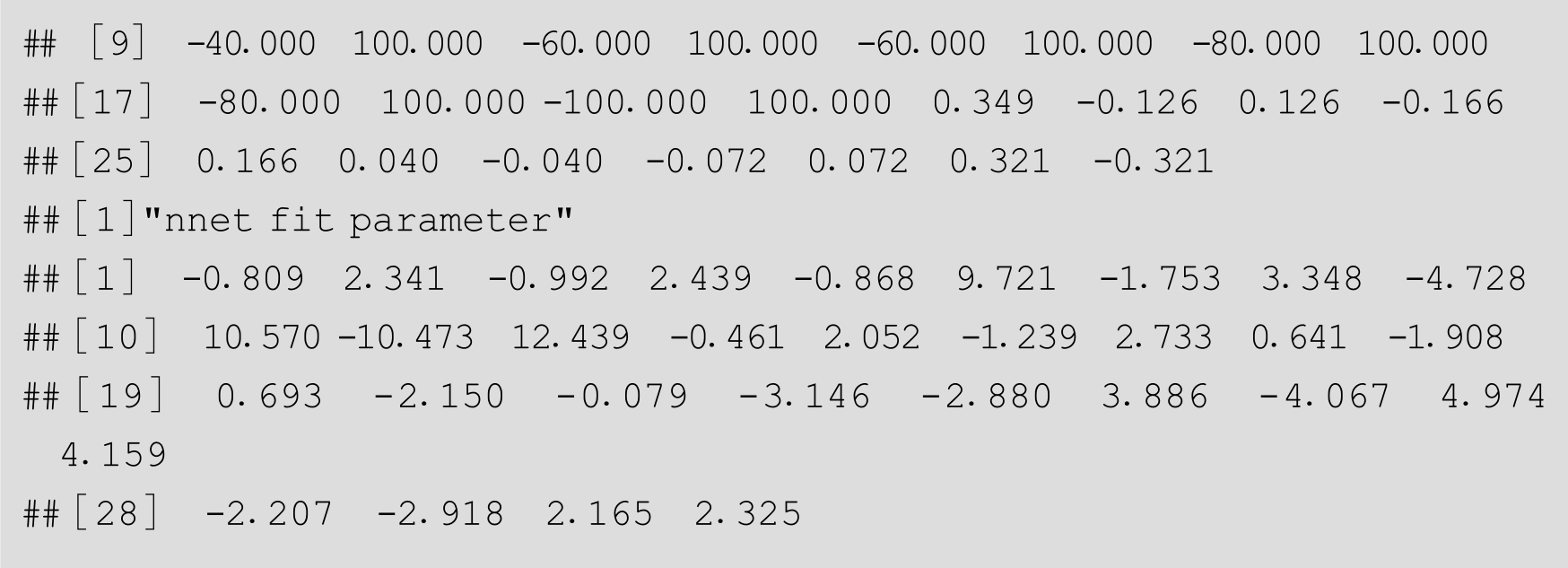 按照上面的分段线性法,设置 w =100,我们将[0,1]平分为5段,进行参数的估算,作为10个隐含节点的参数,这样神经网络模型有31个参数(输入—隐含层的10个权重参数,隐含节点的偏移量10个参数,隐含—输出层的10个权重参数,输出层的偏移量1个参数)。并按照R里面nnet包中模型参数规范组织,作为nnet()函数的初始参数: