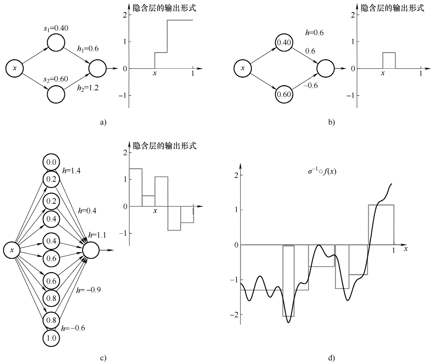 因此,对于一个如图3-24d所示实际的函数,可以先分段矩形逼近,然后按照图3-24b的神经元对的方式,去构建对应的神经网络模型。这样就可以理解成,如果增加隐含节点,ANN有无限的逼近能力。