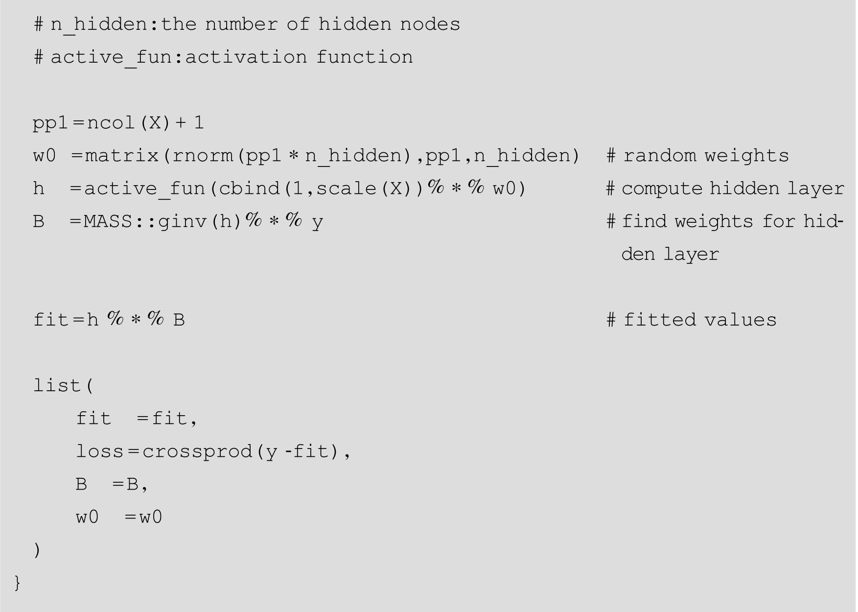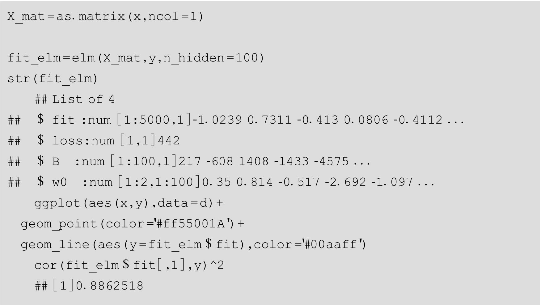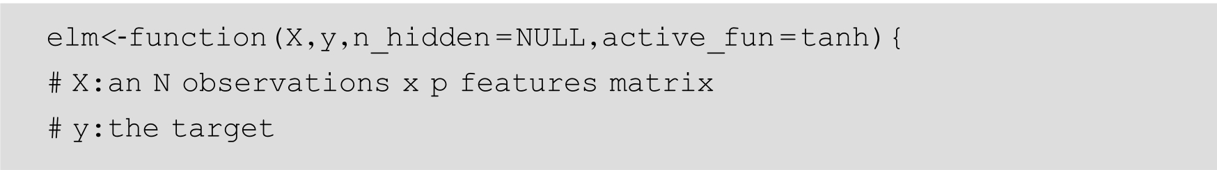 R中elmNN包(以及基于它的Rcpp的新实现的elmNNRcpp包)和ELMR包 [25] 。下面用源代码方式来展示ELM的训练过程。