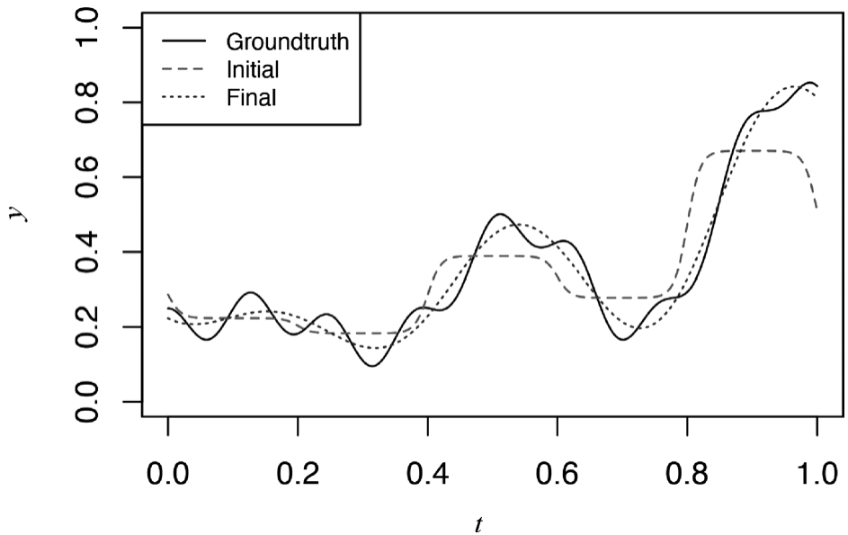 拟合结果如图3-25所示,其中Groundtruth为原始曲线,Initial是初估参数的拟合曲线,Final是nnet()训练出来的曲线。