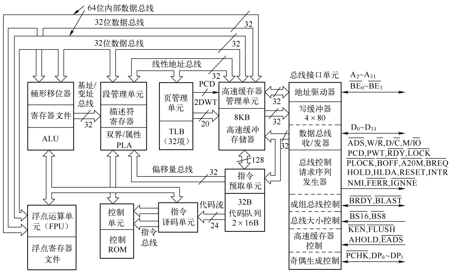 从图2-8可看出,在Cache-ALU-FPU之间采用了64位数据总线直接相连,双精度数据(64位)可一次传送完;Cache和指令预取单元之间采用了128位数据总线,一次可预取16个字节的指令。