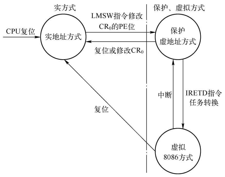 80486有三种工作方式:实地址方式、保护虚地址方式和虚拟8086方式。