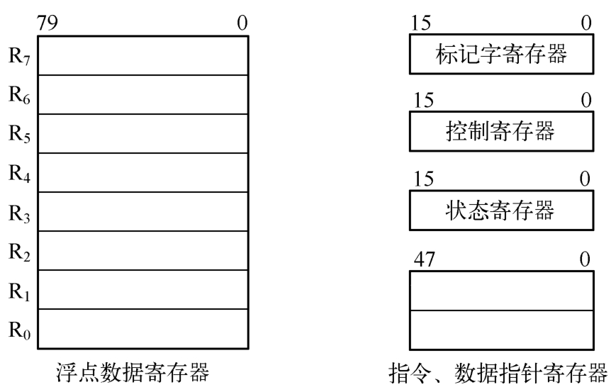 80486的FPU中包含有13个浮点寄存器,如图2-15所示,8个80位浮点数据寄存器R 0 ~R 7 用作固定寄存器组或硬件堆栈;1个16位标记字寄存器用来标记每个数据寄存器的内容;1个16位控制寄存器用于提供FPU的若干处理选择项;1个16位状态寄存器用于反映FPU的总状态;2个48位的指令、数据指针寄存器的作用是为用户编写错误处理程序提供指令和数据指针。
