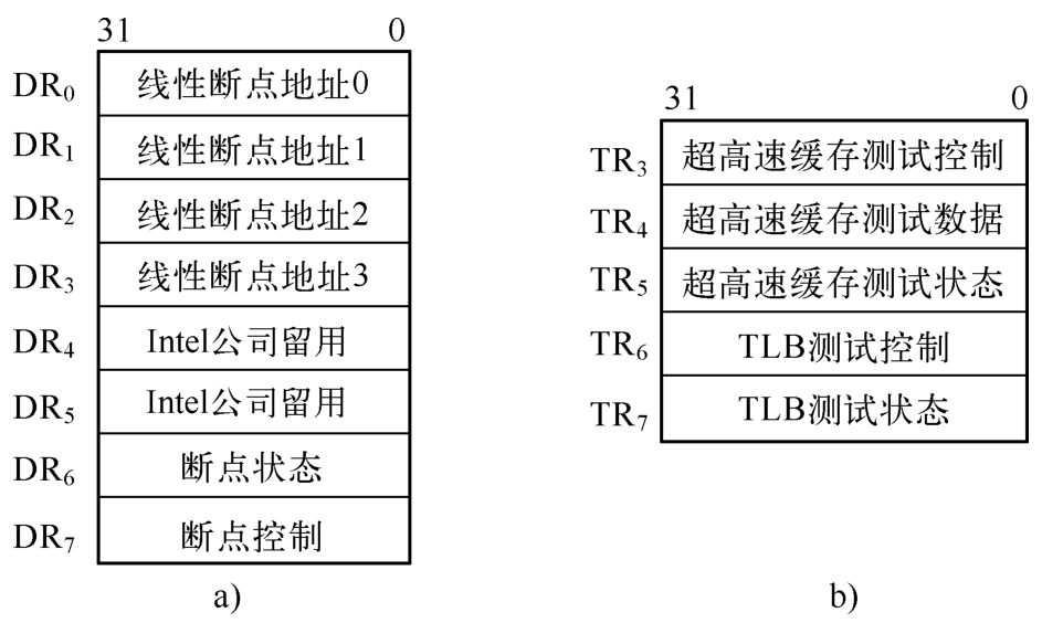 80486提供了8个32位的调试寄存器DR 0 ~DR 7 ,它们为调试提供了硬件支持,如图2-14a所示。其中DR 0 ~DR 3 这4个寄存器用于存放4个断点的线性地址;DR 4 、DR 5 由Intel公司留用;DR 6 为断点状态寄存器,用于说明是哪一种性质的断点以及断点异常是否发生;DR 7 为断点控制寄存器,用于指明断点发生的条件及断点的类型。这些调试寄存器给80486带来了先进的设置数据断点和ROM断点的调试功能。