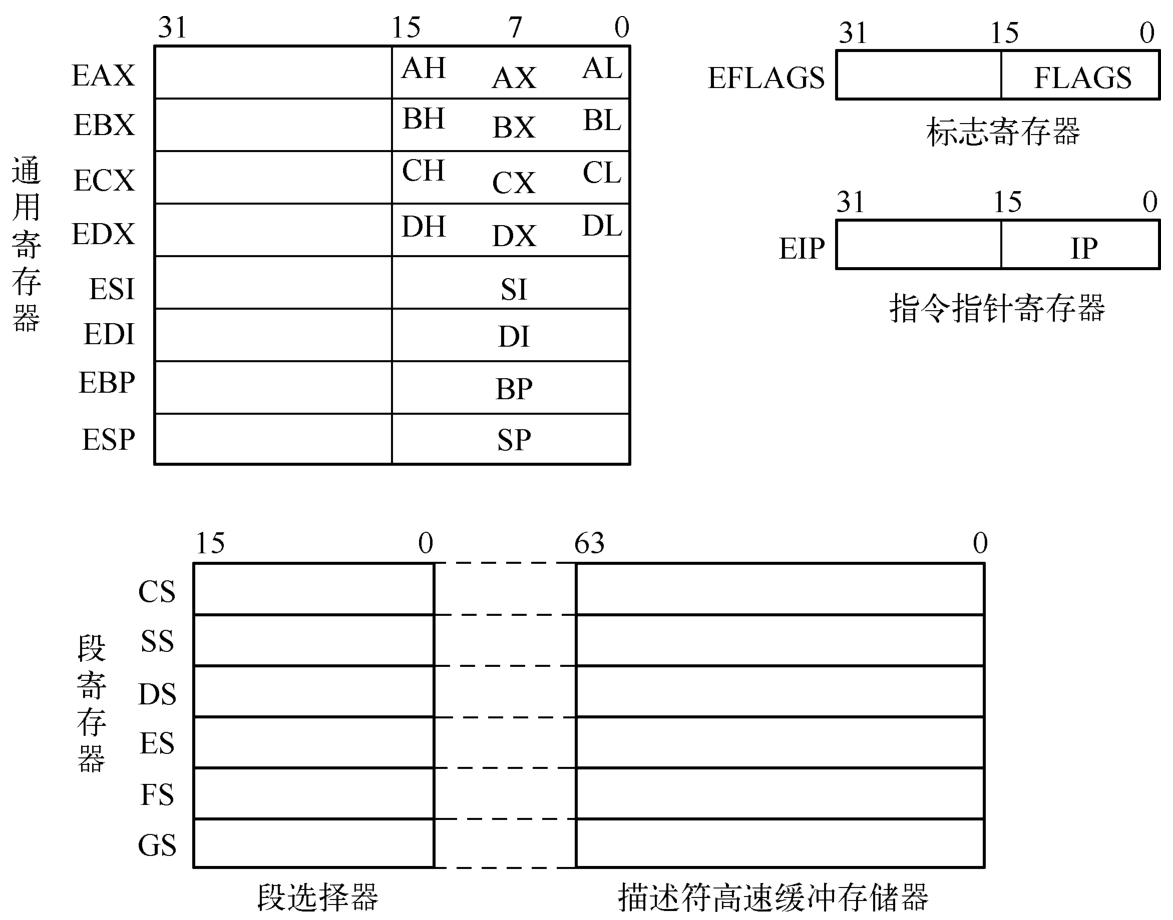 1)通用寄存器。80486有8个32位通用寄存器EAX、EBX、ECX、EDX、ESI、EDI、EBP、ESP,它们是由8086/8088相应的8个16位通用寄存器扩展而来。为了与8086/8088兼容,它们的低16位AX、BX、CX、DX、SI、DI、BP、SP可以单独使用。其中AX、BX、CX、DX还可进一步分成8位寄存器AH、AL、BH、BL、CH、CL、DH、DL使用。