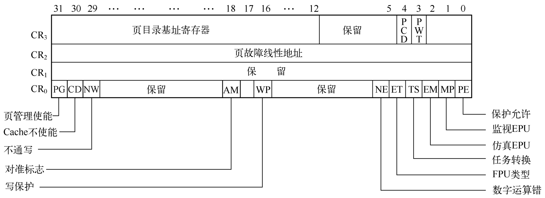 1)控制寄存器。80486有4个32位的控制寄存器(CR 0 、CR 1 、CR 2 和CR 3 ),它们的作用是保存全局特性的机器状态,控制片内Cache、FPU和分段、分页单元的工作。其格式如图2-12所示。