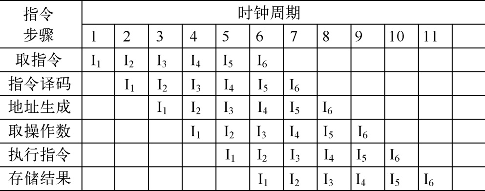 在上述各逻辑单元的支持下,80486按6级流水线方式工作,如图2-9所示。图中的I 1 ~I 6 分别表示指令1~6。在理想情况下,每级需要一个时钟周期。顺着图中I i ( i =1~6)可看出,单独一条指令在流水线中必须依次完成6个步骤中的每一步。从第6个时钟开始,每个时钟周期都有一条指令执行完毕从流水线输出。