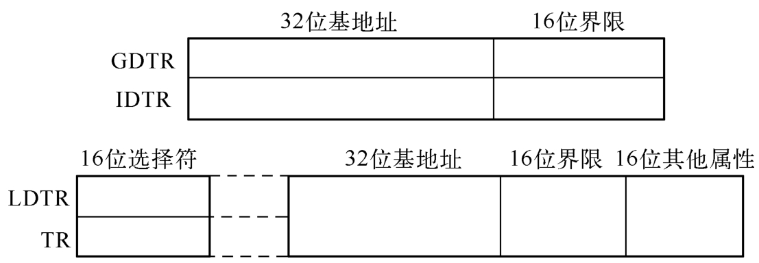 由于局部描述符表LDT和任务状态段TSS可能有多个(每个任务各对应一个),对应的LDTR和TR也就可能有多个。为利于对它们寻址,LDTR和TR在结构上分成选择符和描述符寄存器两部分,描述符寄存器存放的是实质内容,选择符用来检索描述符,其工作原理和6个段寄存器的工作原理相似。全局描述符表(GDTR)和中断描述符表(IDTR),由于系统中只有一个,所以不需要设置选择符。