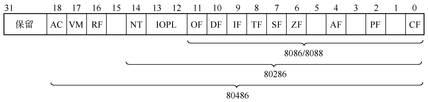 3)标志寄存器(EFLAGS)。80486的标志寄存器EFLAGS是一个32位寄存器,它共定义了15位14个标志,如图2-11所示。这些标志分别归类为状态标志、控制标志和系统标志。