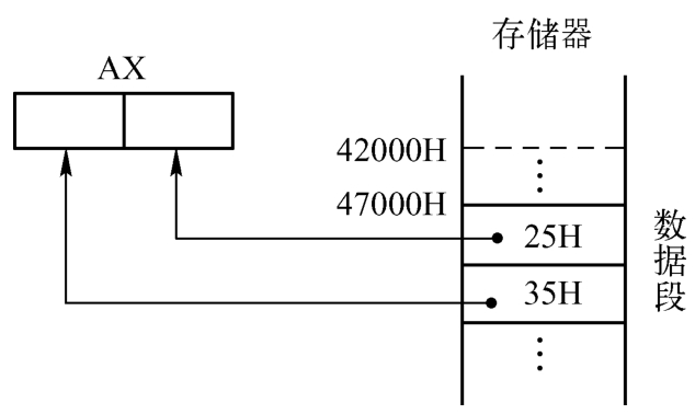 设DS=4200H,SI=5000H,则源操作数所在单元的物理地址=42000H+5000H=47000H,执行情况如图3-3所示。执行结果:AX=3525H。