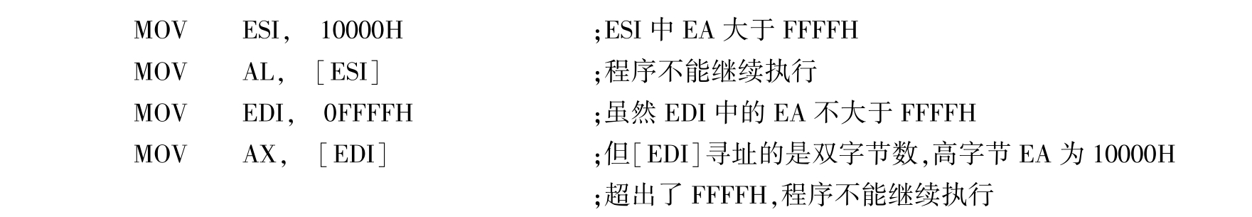 需要注意的一个问题是,在寄存器间接寻址和寄存器相对寻址这两种寻址方式中,程序员可以使用16位的寄存器寻址,也可以使用32位的寄存器寻址。当CPU工作在实地址模式的时候,段长度最大为64KB,不论采用16位寄存器寻址还是32位寄存器寻址,都必须保证CPU最终算出的EA不超过FFFFH,而且操作数最高字节单元的EA也不能超过FFFFH,否则执行寻址操作时程序将出现异常,不能继续执行。例如: