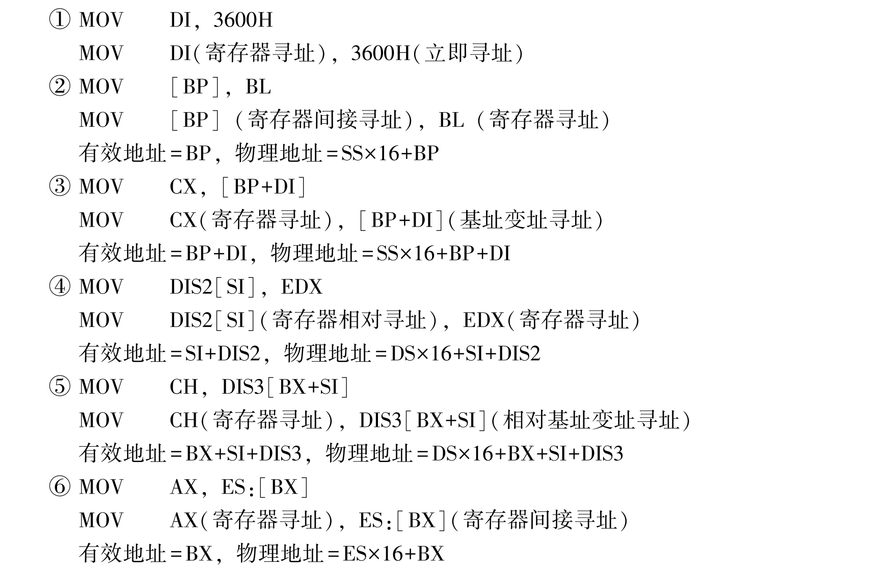 为了讨论操作数寻址方式,利用基本传送指令“MOV ddata,sdata”举例说明,第1操作数ddata为目的操作数,第2操作数sdata为源操作数,该指令的功能是把源操作数的内容复制到目的操作数中。为了讨论转移地址的寻址方式,利用无条件转移指令JMP举例说明。