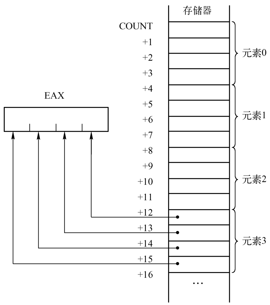 该条指令可以把双字数组COUNT中的元素3送到EDX中,用这种寻址方式可直接在EDI中放入3,选择比例因子4(数组元素为4字节长)就可以方便地达到目的(见图3-4),而不必像在寄存器相对寻址方式中要把变址值计算后装入寄存器中。