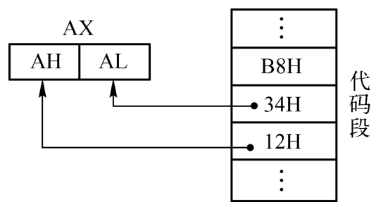 这条指令的机器码为B8H,34H,12H,占3个字节。它的含义是将立即数1234H送到寄存器AX中。机器码在内存单元中是由上至下按从低到高的地址顺序排列的,这也是一般CPU取指令的顺序。操作码部分在前,操作数部分在后。若立即数为16位,则存放时低8位在低地址单元存放,高8位在高地址单元存放。如图3-1所示。