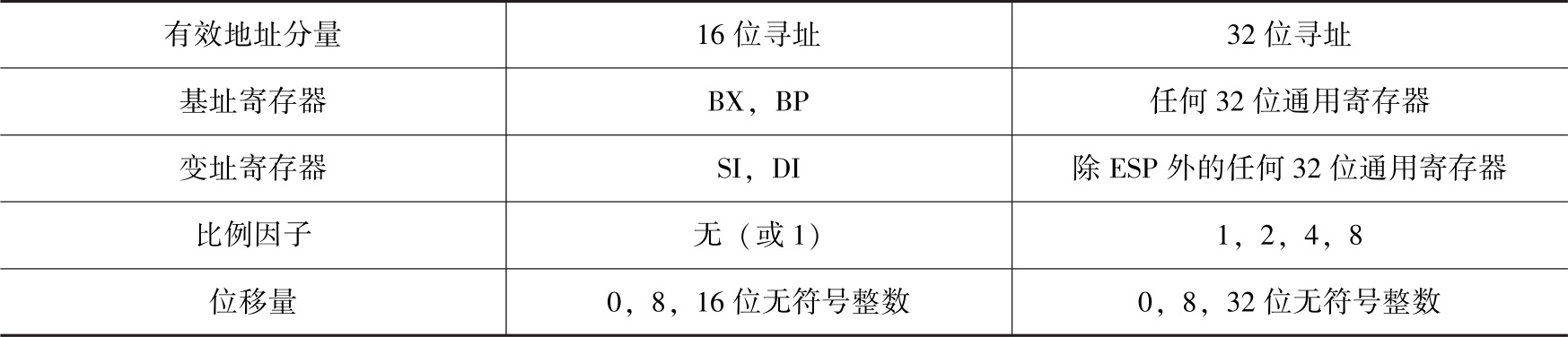 对于32位寻址(工作于保护方式)和16位寻址(工作于8086方式)时,可作基址、变址的寄存器,比例因子以及位移量的取值有所不同。表3-1给出了这两种情况下4个分量的规定。