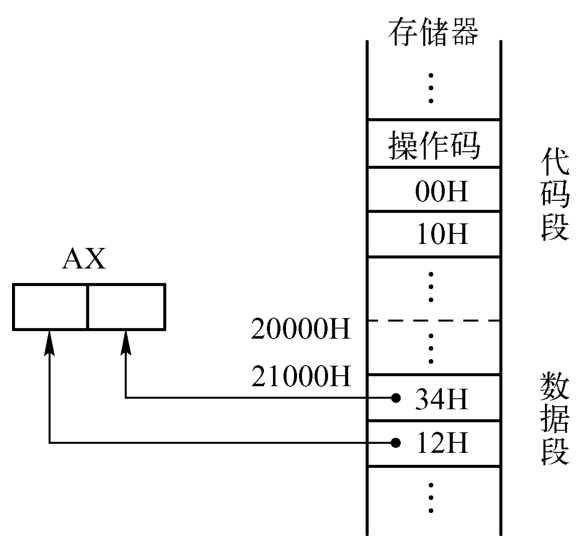 假设DS=2000H,则源操作数所在单元的物理地址=20000H+1000H=21000H,其执行情况如图3-2所示。执行结果为AX=1234H。应注意的是,这种形式下,指令中的DS不能省略。