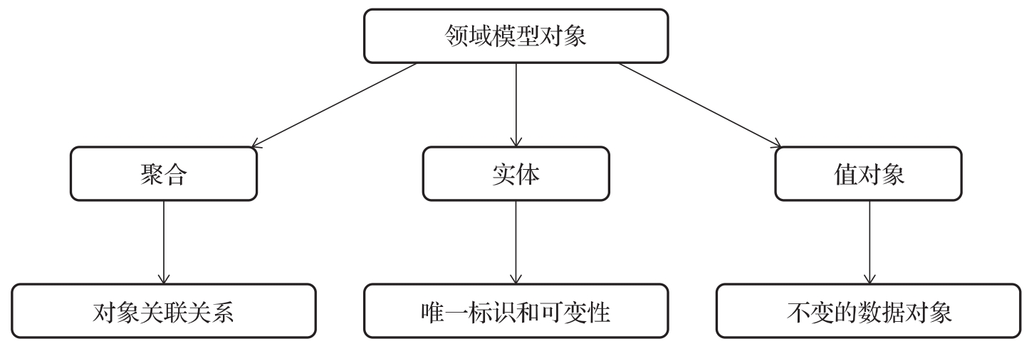 显然,领域驱动设计的过程与数据驱动完全不同。在DDD中,我们关注的是领域模型对象而非数据本身。虽然以数据作为主要关注点的开发模式也能完成对系统的构建,但我们认为面向领域的模型对象才是通用语言的有效载体。究其原因,很多对象并不能简单地用它们的数据属性来定义,而需要通过一系列的标识和行为来定义。在DDD中,领域模型对象包括三大类型,即聚合、实体和值对象,如图1-7所示。