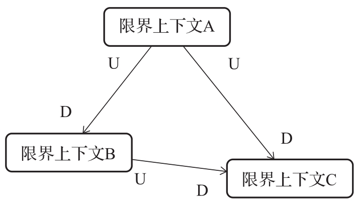 在图2-2中存在限界上下文A、限界上下文B和限界上下文C。限界上下文A同时位于限界上下文B、C的上游;限界上下文B相对限界上下文A而言处于下游,但相对限界上下文C而言处于上游;限界上下文C则处在整个系统的最下游。