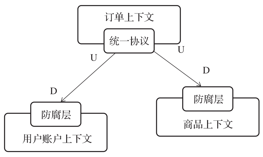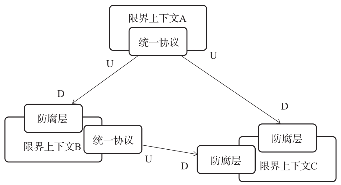 显然,防腐层模式面向下游上下文,而统一协议模式面向上游上下文。在对任何子域和上下文进行提取时,确保从组织关系和集成模式上对上下文的集成过程进行抽象。图2-3即是图2-2所示的上下文关系在集成方案上的一种表现形式。