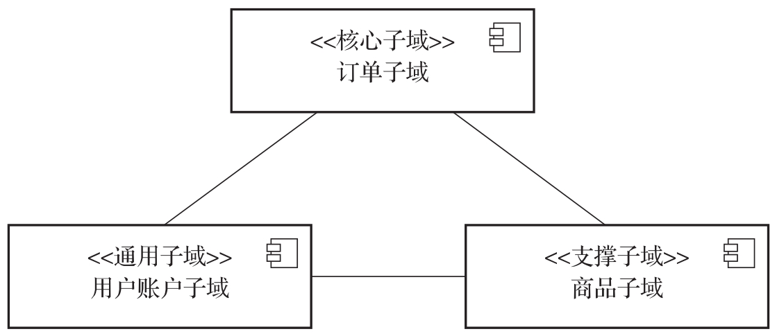 从子域的分类上讲,用户账户子域比较明确,显然应该作为一种通用子域。而订单是电商类系统的核心业务,所以订单子域应该是核心子域。至于商品子域,在这里比较倾向于支撑子域。整个系统的子域划分如图2-1所示。