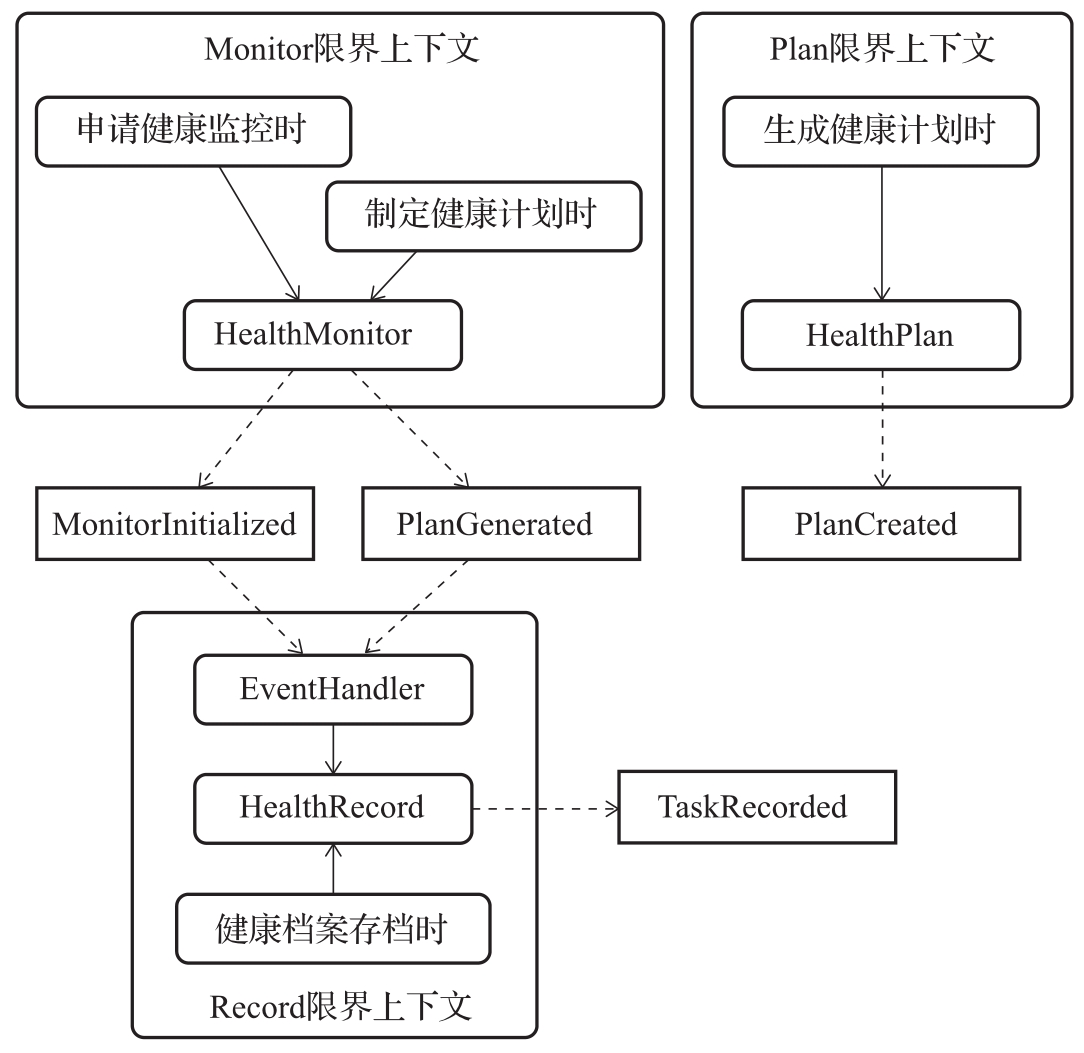 可以看到,在Monitor限界上下文中,当用户申请健康监控成功之后,该上下文可以发送一个“监控已启动”(MonitorInitialized)事件;而当系统为用户创建了健康计划之后,也可以生成一个“计划已制定”(PlanGenerated)事件。同样,对Plan限界上下文而言,当系统根据一组健康任务生成一个有效的健康计划时,我们可以生成一个“计划已创建”(PlanCreated)事件。