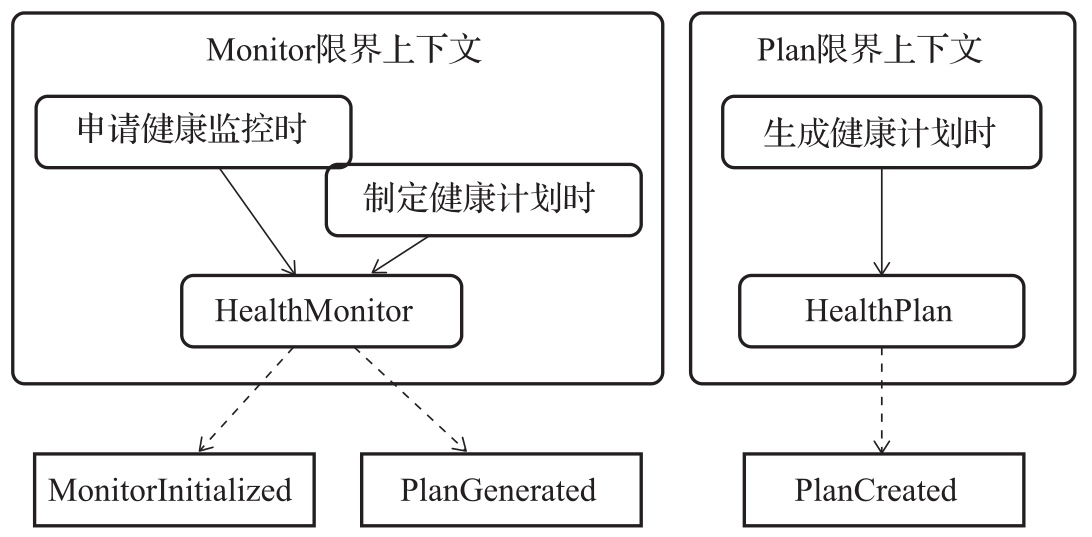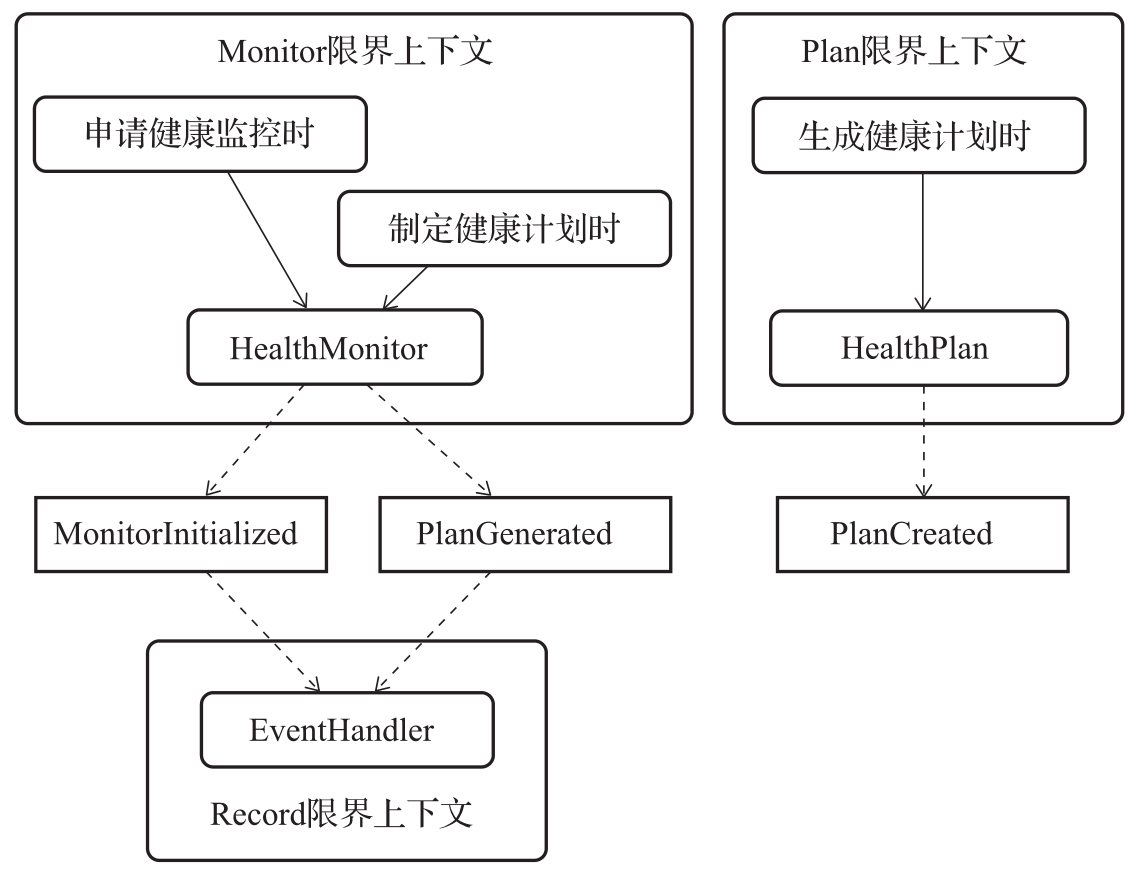 可以看到,在Monitor限界上下文中,当用户申请健康监控成功之后,该上下文可以发送一个“监控已启动”(MonitorInitialized)事件;而当系统为用户创建了健康计划之后,也可以生成一个“计划已制定”(PlanGenerated)事件。同样,对Plan限界上下文而言,当系统根据一组健康任务生成一个有效的健康计划时,我们可以生成一个“计划已创建”(PlanCreated)事件。