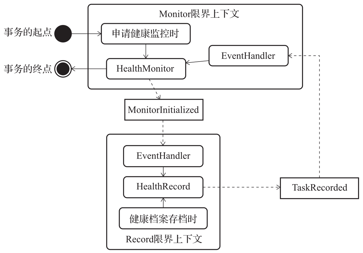 请注意,Record限界上下文在接收并处理完来自其他限界上下文的领域事件时,也可以发布一个表示健康档案信息已经被成功记录的领域事件,如“健康任务已存档”(TaskRecorded)事件。图3-16在图3-15的基础上对这一过程做了补充。