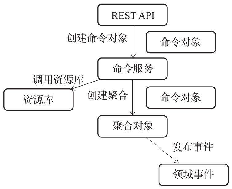 明确了命令对象的使用者是聚合,接下来就需要创建命令服务。在命令服务中,命令对象通常由位于更上层的REST API构建并传递。命令对象相关的各组件之间的关系如图3-20所示。