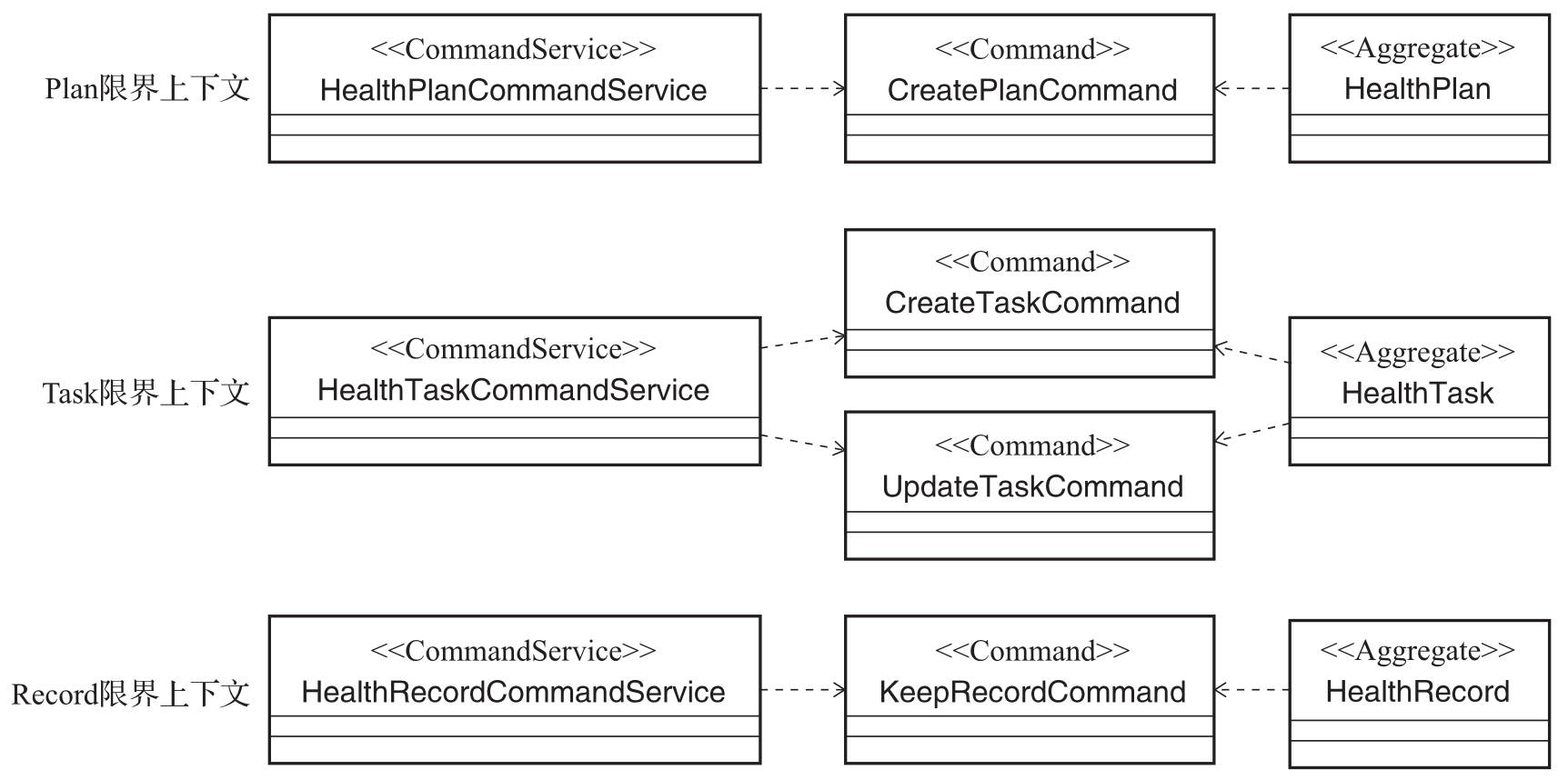 而对整个HealthMonitor案例系统而言,其他3个限界上下文的命令服务如图3-22所示。