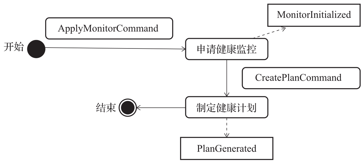 在图3-19中,我们从接收一个用于申请健康监控的ApplyMonitorCommand命令对象开始,HealthMonitor聚合处理完这个命令对象之后会发布一个MonitorInitialized领域事件。然后,用户想要生成健康计划时,就会使用CreatePlanCommand命令对象,当处理完这个命令对象之后,HealthMonitor聚合会发布对应的PlanGenerated事件。