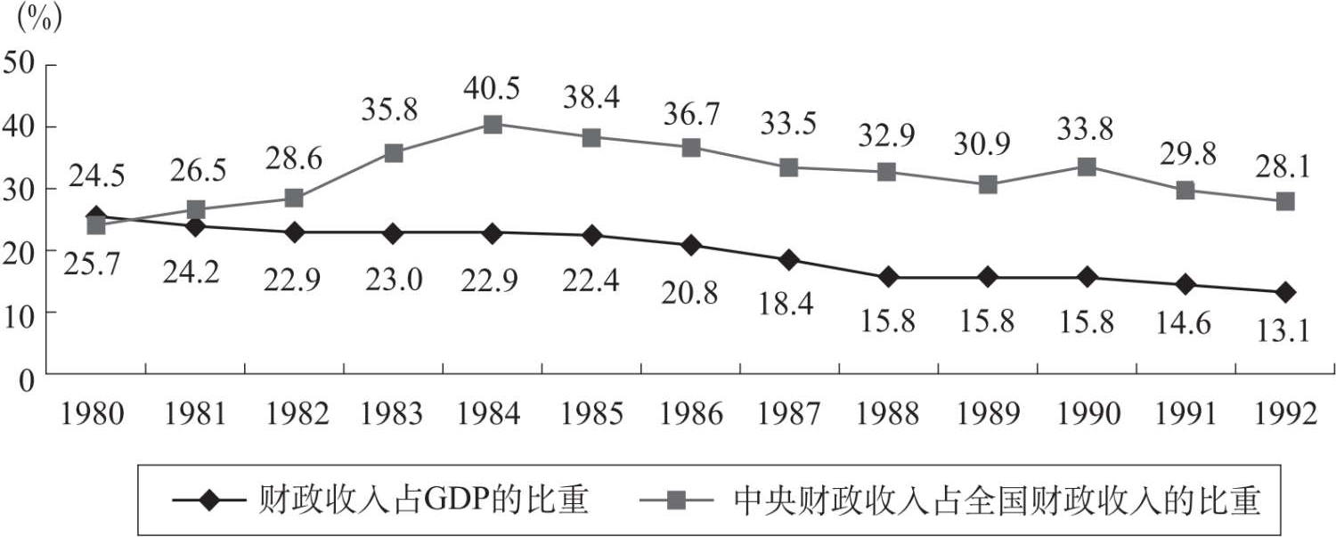 20世纪80年代中期以来,我国财政收入占GDP的比重与中央财政收入占整个财政收入的比重即所谓的“两个比重”出现持续下降,分别从1984年的22.9%和40.5%下降到1992年的13.1%和28.1%(见图1—1),国家财政特别是中央财政陷入严重危机,业已到了濒临“破产”的边缘,中央政府处于前所未有的弱势地位。