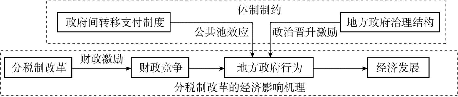 1994年分税制改革的根本目的是通过明确中央政府与各级地方政府间的责、权、利关系,促使地方政府职能优化,更好更快地发展地区经济,其中的关键在于分权化改革带来的激励和约束机制及其对地方政府行为的深刻影响。现有理论刻画财政分权对地方政府行为影响时,主要强调财政竞争机制的重要性(Brennan and Buchanan,1980;Wilson,1986),并主张利用庇古式转移支付政策矫正财政竞争带来的负面影响(Zodrow and Mieszkowski,1986)。不过,由于成本外溢和信息不对称,矫正性转移支付政策设计需要考虑到地方政府行为选择和道德风险等激励问题(Bordignon et al.,2001)。此外,行政管理架构、政府组织结构作为财政分权的重要外部制度环境也会不可避免地对地方政府行为产生深刻影响(Hocman et al.,1995;Gilbert and Picard,1996;贾康、白景明,2002;王小龙,2006;郭庆旺、贾俊雪,2010)。因此,我们以地方政府行为为核心,以财政分权、财政竞争和经济发展为主线,构建一个简单逻辑分析框架(见图1—2)全面梳理和剖析1994年分税制改革的经济影响及其逻辑机理。