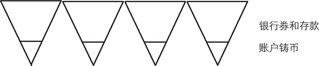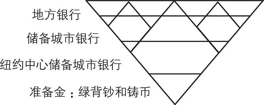 图1-2显示的是国民银行体系的倒金字塔结构。纽约中心储备城市银行以铸币和绿背钞为基础,金字塔式扩张银行券和存款账户;储备城市银行则以铸币和存放于纽约中心储备城市银行的绿背钞为基础,金字塔式扩张银行券和存款账户;地方银行则以上述两者为基础进行扩张。这就意味着,如果纽约中心储备城市银行实施扩张并扩大银行券和存款账户的发行,对纽约中心储备城市银行有兑付要求的其他银行并不会对其进行核查。相反,储备城市银行可以通过在纽约中心储备城市银行累积增加自己的存款,从而扩大本行的放贷和负债。反过来,地方银行也能够通过在储备城市银行和纽约中心储备城市银行两处同时增加存款来金字塔式扩张信贷。通过纽约城市银行的金字塔式扩张,整个国家都能统一且相对不受约束地实施通货膨胀。