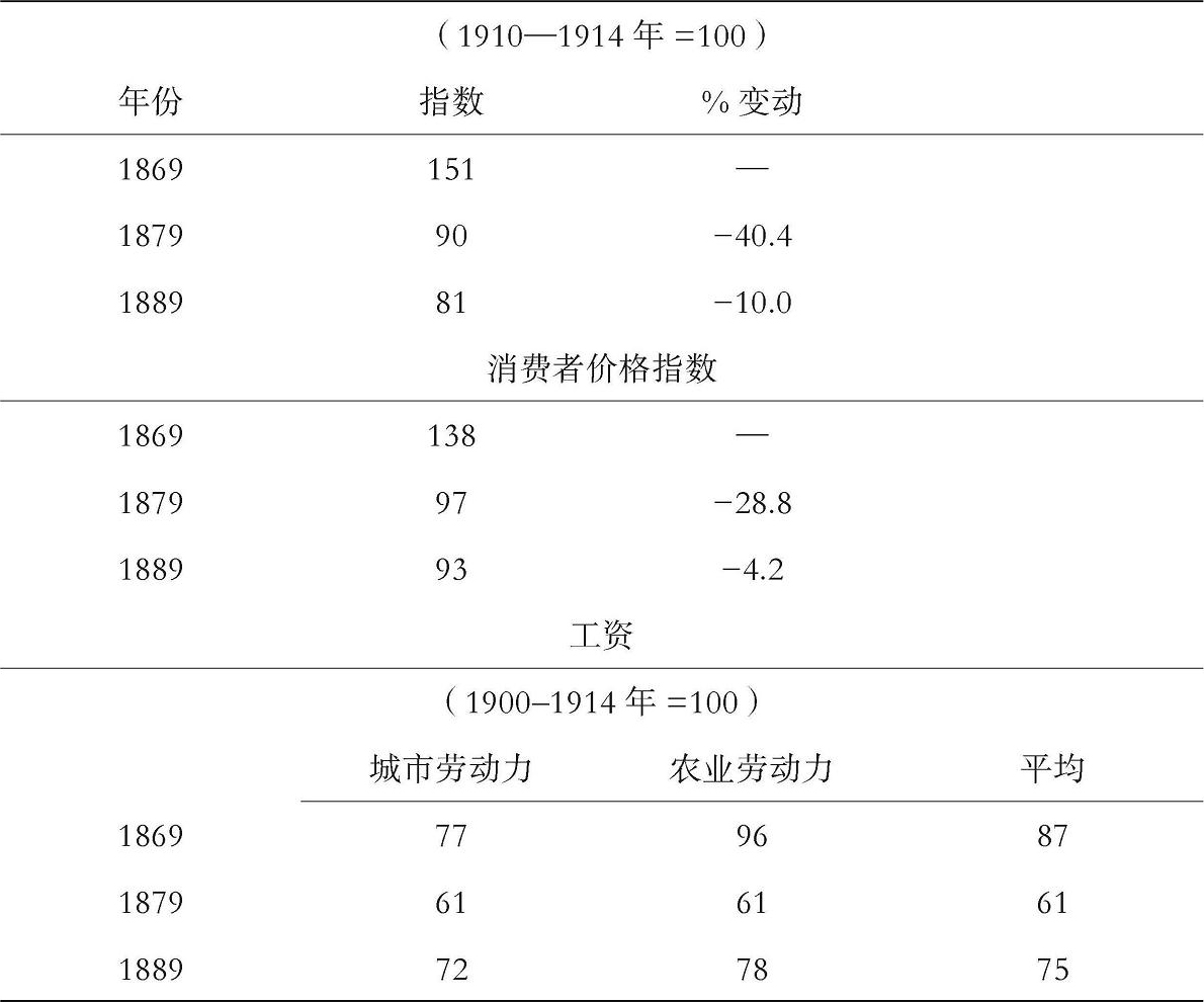 上述情况可以以图表方式通过恢复兑换前后10年间的工资和价格水平来表示。虽然在19世纪70年代和80年代,价格一直在下降,但工资只在绿背钞时期进入下降通道,从1879—1889年却一直处于上升通道。