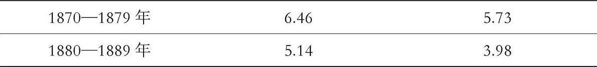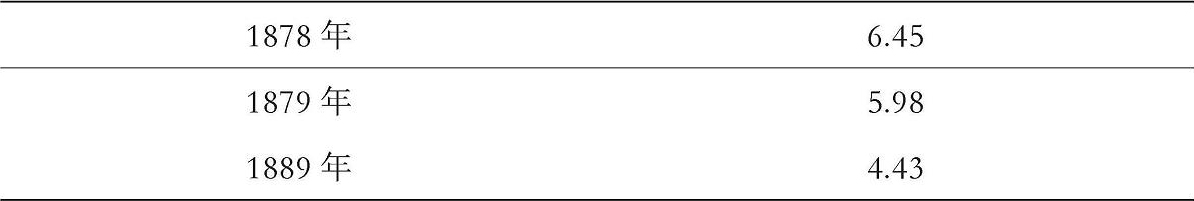 为了判断当时的长期利率,最好不要用我们今天使用的长期政府债券作为衡量标准。1863—1864年的《国民银行法》明确要求,这些债券必须用来为银行券提供担保。这样,就产生了对政府债券的需求,正如霍默所说:“到19世纪70年代中期,〔这种做法〕将政府债券价格推高到其收益率远低于可接受的长期利率的水平。”但商务部追踪了未经调整的美国铁路债券收益率指数。我们在下面列出了1878年(即回归金本位的前一年),以及1879年和1889年的收益率。